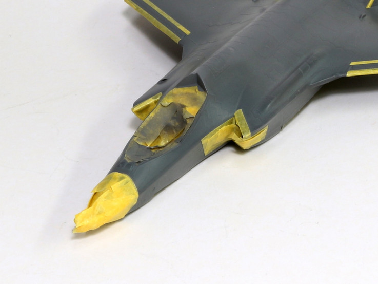 The plastic backing plates insure a flush external fuselage intake joint while retaining the panel line essential for differentiating the RAM grey from the surrounding dark grey surface.