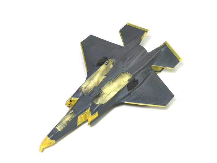 With bomb bays, wheel wells and cockpit masked, the model was sprayed Revell 47 grey. Using photos of Adir 930, the various RAM areas were masked with strips of Tamiya Tape and the entire model painted Humbrol 79 (RAL7012) Grey. The amount of contrasting grey RAM areas is a lot less than on early F-35A airframes, so there was no need for the use of the kit to provide RAM decals. The landing gear and bomb bay doors were also sprayed Humbrol 79.
