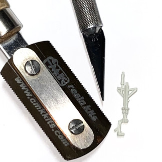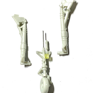 Moving on to the landing gear, the main gear actuators have annoying flash that must be carefully removed without breaking off the cylinder struts. The kit's plastic is a bit soft so to reinforce the nose gear strut, I bored the aft side (less visible) center using a razor saw; widen the channel with the back end of a no.11 blade; drill a hole midway through the nose wheel and insert a .05” piano wire through the strut and wheel. Initial bonding is done using liquid cement. The channel is then filled with cyanoacrylate cement which also reinforces the bonding of the strut and metal rod. Note the offset location of the nose gear mounted taxi light which was added after I drilled it to accept a reflective lens. The orientation of the main and nose gear forks is ambiguous in the kit's instructions, so I referred to closeup photos of the landing gear to confirm their position.