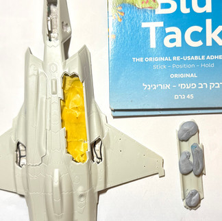Revell 1/72 F-35A is molded in relatively soft plastic which requires careful handling and some part reinforcement. To protect the sharp end of the fuselage nose halves prior to joining them together, I wrapped them with tissue and masking tape. I usually diverge from the kit's building sequence, preferring to assemble parts that require additional time for cement hardening. I began with the assembly of the external stores, setting aside the kit's assembled laser guided bombs for use on other models such as the F-15i or F-16C/D.